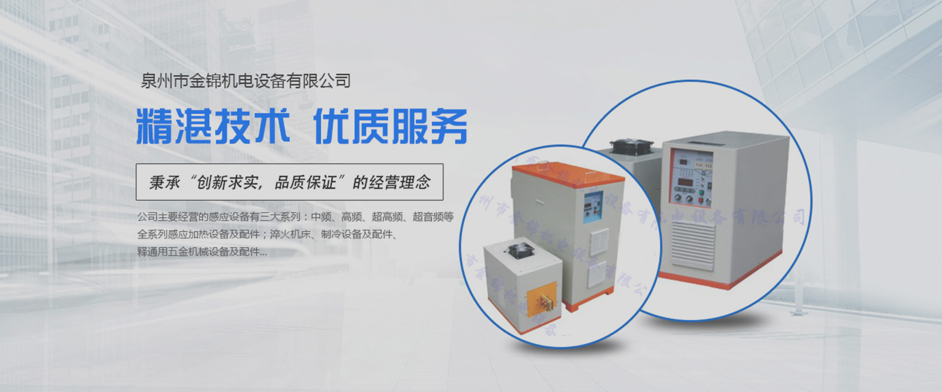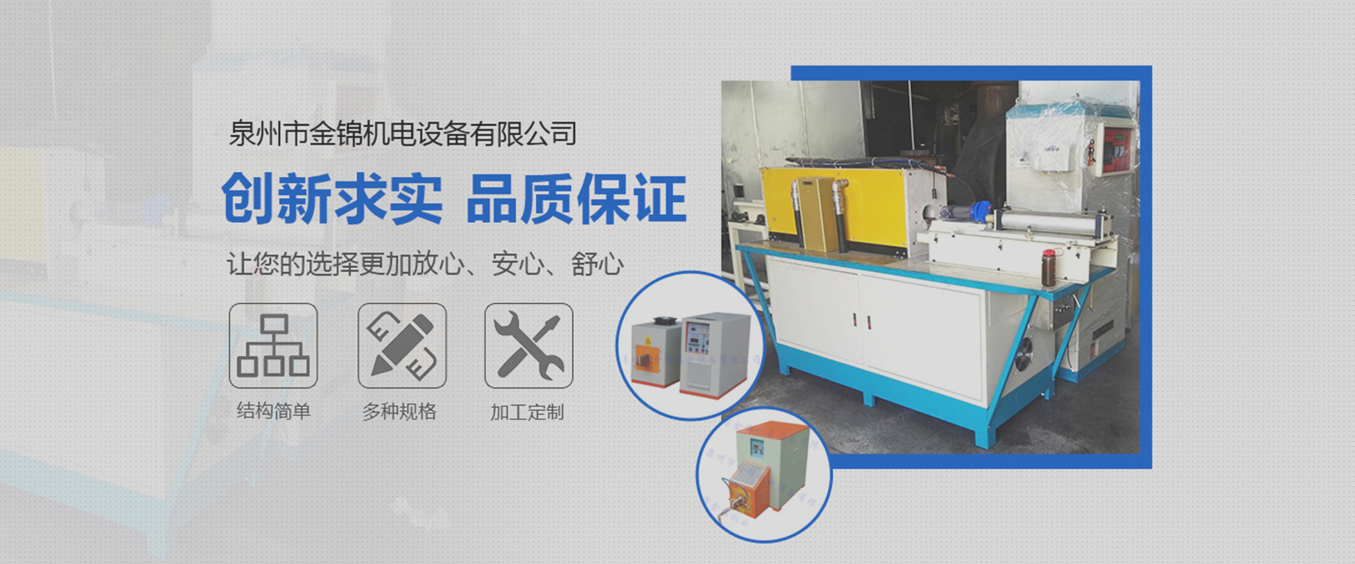 ??泉州市金錦機(jī)電設(shè)備有限公司,是一家專(zhuān)業(yè)生產(chǎn)銷(xiāo)售感應(yīng)加熱設(shè)備與優(yōu)化解決方案的高新技術(shù)企業(yè)。公司自2006年成立以來(lái),以精湛的技術(shù)、優(yōu)質(zhì)的服務(wù)、優(yōu)良的產(chǎn)品贏(yíng)得了廣大用戶(hù)的認(rèn)可和信賴(lài)。產(chǎn)品銷(xiāo)售于全國(guó)各地。公司一貫堅(jiān)持“立足本職,敢于承擔(dān)”的工作作風(fēng),秉承“創(chuàng)新求實(shí),品質(zhì)保證”的經(jīng)營(yíng)理念,在感應(yīng)加熱行業(yè)中不斷發(fā)光發(fā)熱…